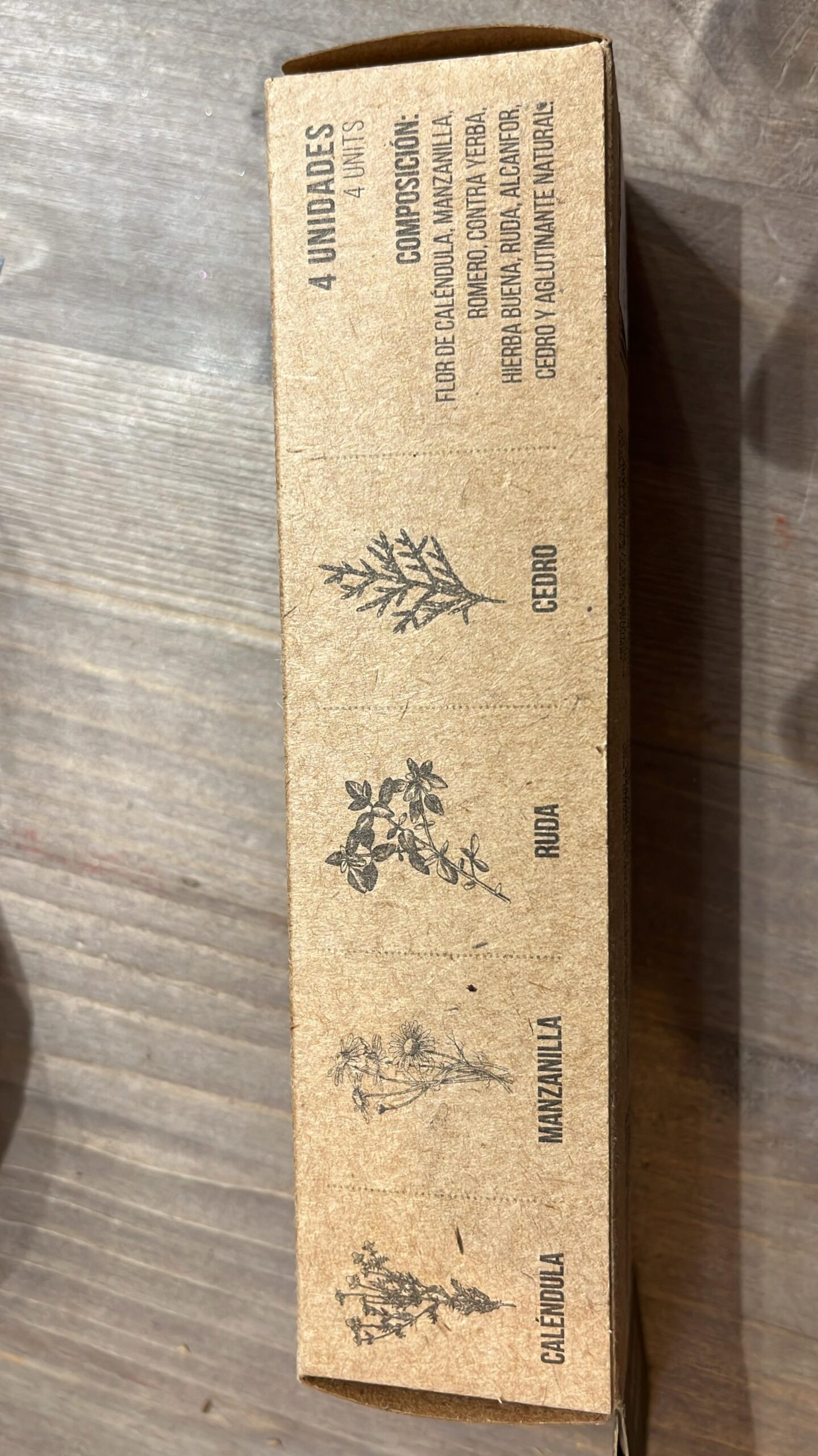 Composición: Flor de caléndula, manzanilla, romero, contra hierba, hierba buena, ruda, alcanfor y aglutinante natural.
