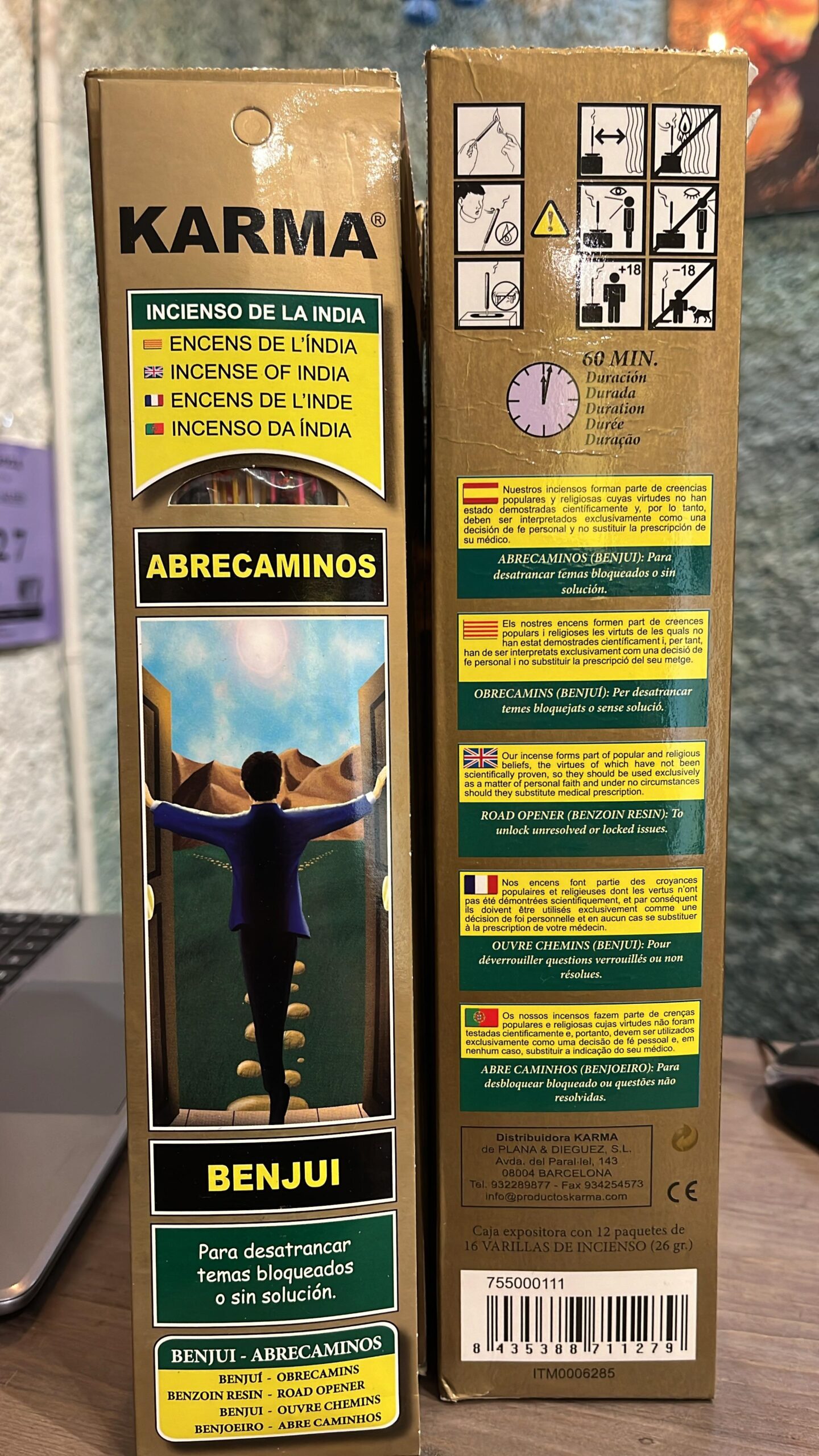 16 varillas de incienso abrecaminos (benjuí), 26 gr.