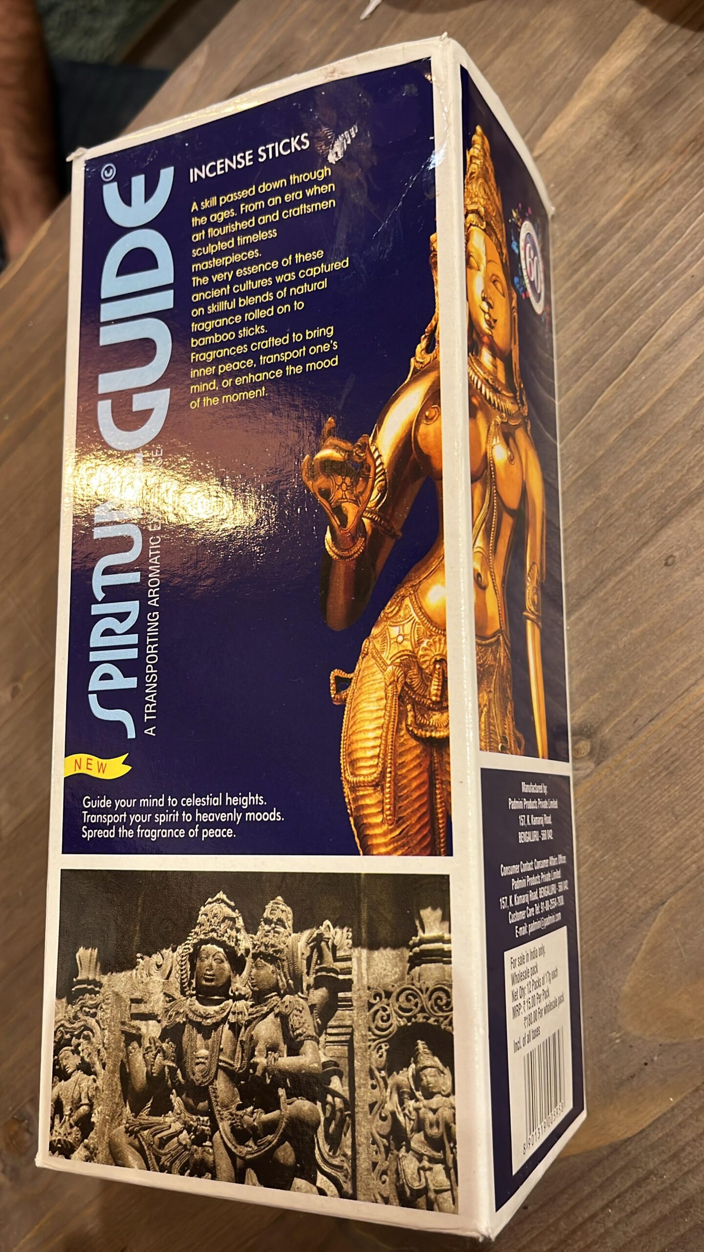 El más popular de todas las fragancias de incienso padmini. Este tiene una fragancia suave con una nota balsámica. Un arte heredado de los tiempos, cuando el arte floreció, y esculturas inmortales de la arquitectura fueron creadas. Como complemento de su belleza una mezcla hábil de fragancias naturales laminadas en palos. Guia espiritual es uno de ellos.
